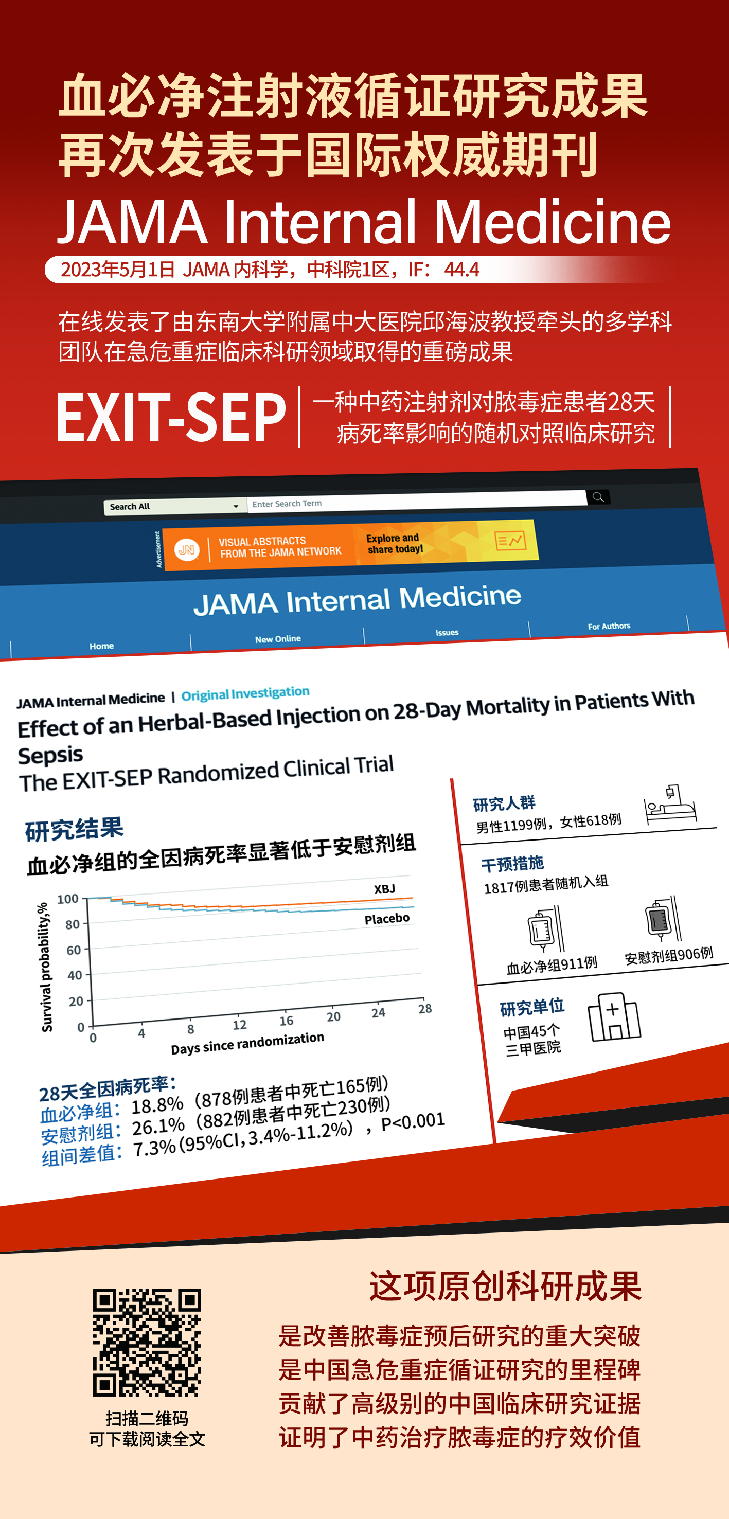 2023Äê5Ô£¬£¬£¬£¬£¬¡¶JAMA Internal Medicine¡·£¨JAMA.ÄÚ¿ÆÑ§£¬£¬£¬£¬£¬2021ÄêÓ°ÏìÒò×Ó£º44.4£©È«ÎÄÔÚÏß½ÒÏþÁËÒ»ÖÖÖÐÒ©×¢Éä¼Á¶Ôŧ¶¾Ö¢28Ì첡ËÀÂÊÓ°ÏìµÄRCTÑо¿ÂÛÎÄ¡£¡£¡£¡£¡£¸ÃÑо¿Óɶ«ÄÏ´óѧÁ¥ÊôÖдóÒ½ÔºÖØÖ¢Ò½Ñ§¿ÆÇñº£²¨½ÌÊÚǣͷ£¬£¬£¬£¬£¬ÌìÏÂ45¼ÒÈý¼×¼¶Ò½ÔºÖØÖ¢¡¢¼±Õï¡¢ºôÎü¶àѧ¿ÆÍŽáÍê³É¡£¡£¡£¡£¡£Í¨¹ý¶Ô1817Àýŧ¶¾Ö¢»¼ÕßµÄÊý¾ÝÆÊÎö£¬£¬£¬£¬£¬Ö¤ÊµÍ¨ÀýÖÎÁÆÍŽáѪ±Ø¾»×¢ÉäÒºÖÎÁÆ£¬£¬£¬£¬£¬¿ÉÏÔÖø½µµÍŧ¶¾Ö¢»¼Õß28ÌìÈ«Òò²¡ËÀÂÊ7.3%£¬£¬£¬£¬£¬»®·Ö½µµÍICU²¡ËÀÂʺÍסԺ²¡ËÀÂÊ5.8%£¬£¬£¬£¬£¬28ÌìÄÚδסICUÌìÊý¶à2.1Ì죬£¬£¬£¬£¬28ÌìÀÛ¼ÆÎ´Ê¹ÓûúÐµÍ¨ÆøÌìÊý¶à1.8Ìì¡£¡£¡£¡£¡£ÕâÏîÔ´´¿ÆÑÐЧ¹û£¬£¬£¬£¬£¬ÊǸÄɯŧ¶¾Ö¢Ô¤ºóÑо¿µÄÖØ´óÍ»ÆÆ£¬£¬£¬£¬£¬ÊÇÖйú¼±Î£ÖØÖ¢ÑÖ¤Ñо¿µÄÀï³Ì±®£¬£¬£¬£¬£¬Ð¢Ë³Á˸߼¶±ðµÄÖйúÁÙ´²Ñо¿Ö¤¾Ý£¬£¬£¬£¬£¬Ö¤ÊµÎúÖÐÒ©ÖÎÁÆÅ§¶¾Ö¢µÄÁÆÐ§¼ÛÖµ¡£¡£¡£¡£¡£